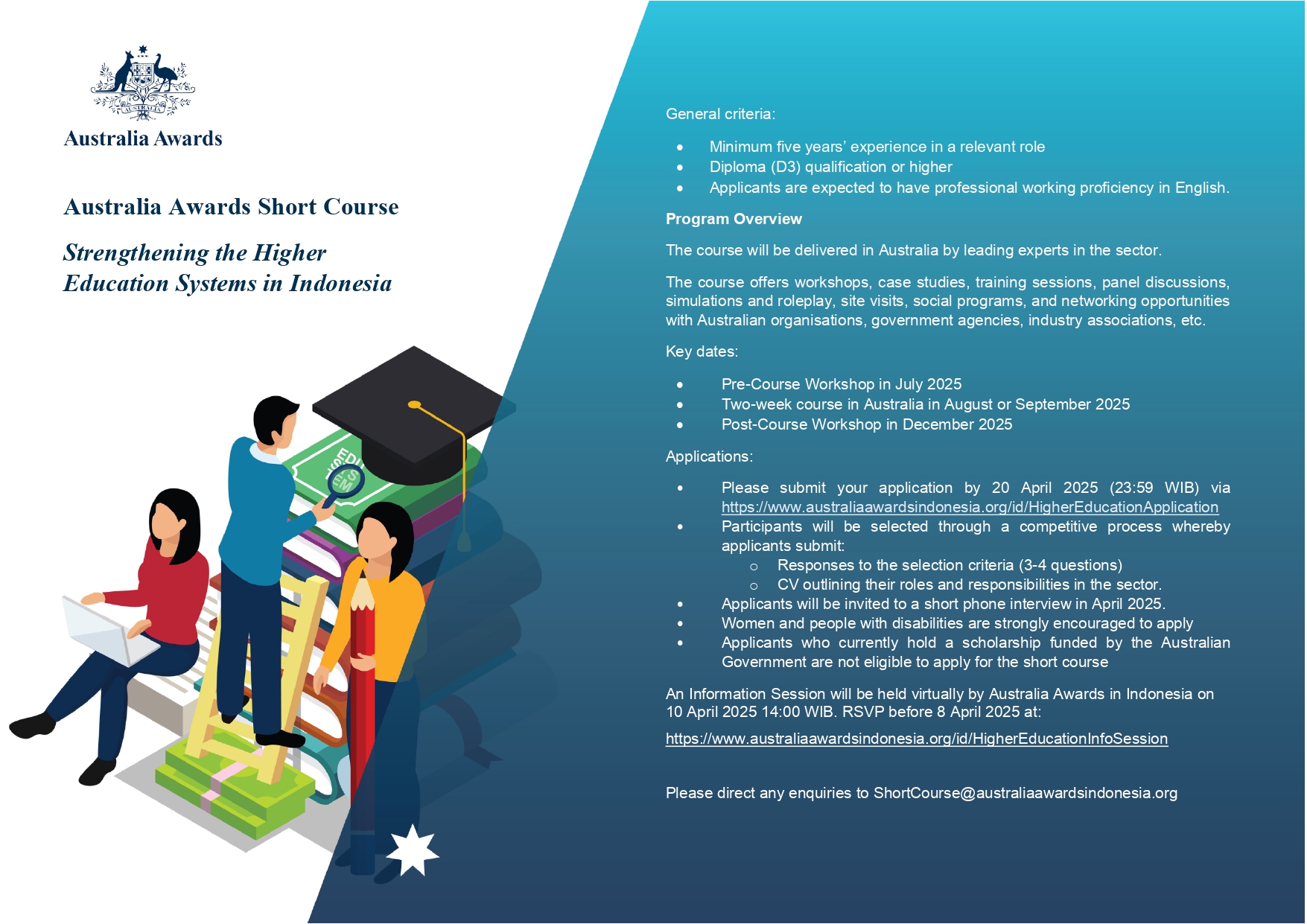 An information session will be held virtually by Australia Awards in Indonesia on 10 April 2025 at 14:00 WIB. This session will guide applicants on the application procedures, including the online application system, selection scheme, and interview process. RSVP before 8 April 2025 using this link.
